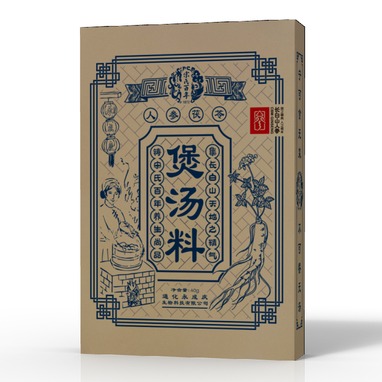 人參茯苓煲湯料 本款煲湯料精選人參、茯苓、山藥、決明子、甘草、山楂、苦杏仁、荷葉等多味優(yōu)質(zhì)藥食同源的中草藥加工而成。 人參茯苓等配伍特點:健脾化濕,潤腸通便。 可與牛肉、羊肉、雞肉、鯽魚等搭配使用,尤其與雞肉搭配使用為最佳??捎糜谄胀ù蟊婐B(yǎng)生保健,是體重超標的高血脂人士之理想佳品,四季皆可使用。 本款煲湯料的使用方法:將6兩(300克)的肉類及本煲湯料一起放入適量的水中,以文火煮2——5小時,調(diào)味食用。